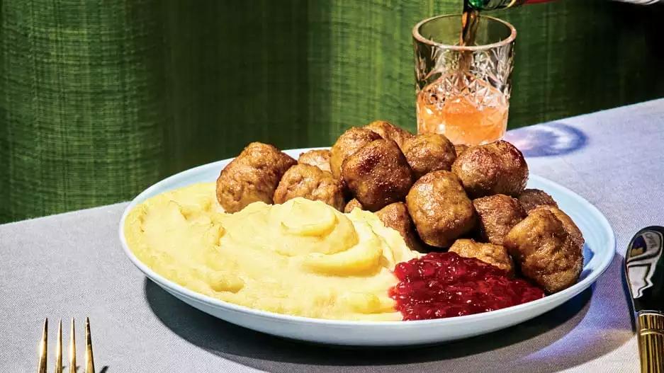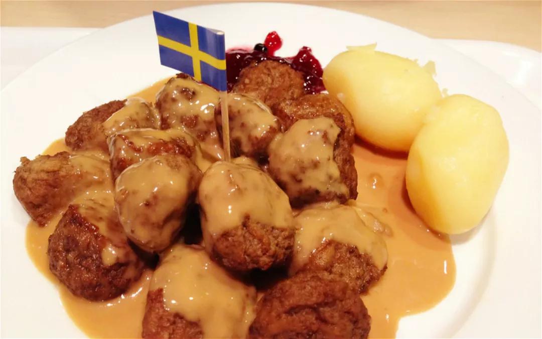 土豆泥配浇上酱汁和越橘果醬的肉丸,再插上一个小小的瑞典国旗,这就组成了我们熟悉的宜家瑞典肉丸。