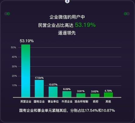 在使用企业微信的用户中,民营企业占比高达53.19%。而国有企业和事业单位紧随其后,粉笔占比17.54%和10.87%。