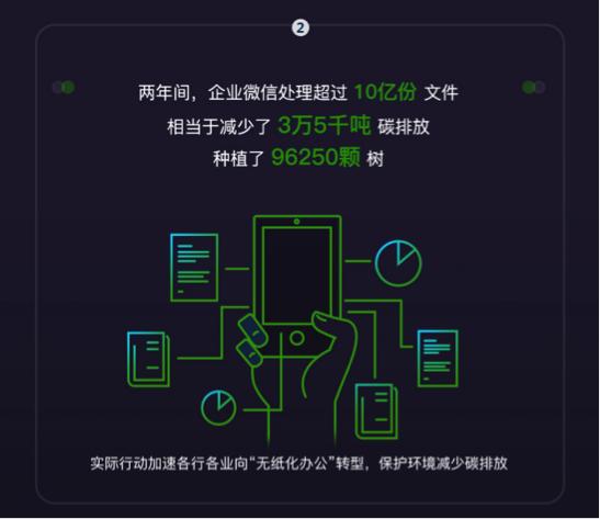 报告显示,迄今为止企业微信处理了超过10亿份文件,相当于减少了3万5千吨碳排放,种植了96250棵树,以实际行动加速各行各业向“无纸化办公”转型,保护环境减少碳排放。