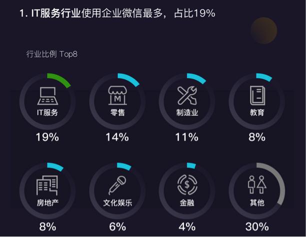 报告数据还显示,企业微信已经渗透到50多个行业,其中IT服务、零售、制造业行业占比排名前三。