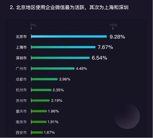 在地域上,北京、上海、深圳成为使用企业微信最活跃的地区,占比分别为9.28%、7.67%和6.54%。