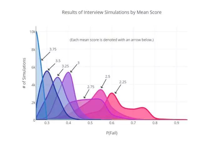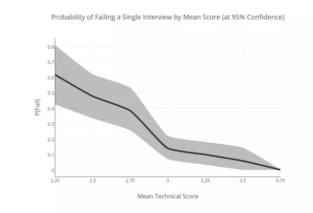然而,使用这些分布图,只能计算出得到某个平均分数的面试者会失败的概率(参见下面阴影区域 95% 置信区间)。而整体素质很强的人(例如平均值~ = 3),可能会搞砸技术面试,高达 22%。这一事实,表明了面试过程肯定还有改进的余地,同时也使频谱中间模糊区域更大(即看不清楚状态的人会更多)。
