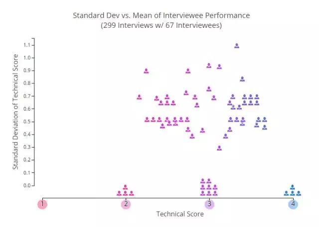 我们的数据显示:同一个人在一次面试中的表现,其数据有相当大的波动,这很让人惊讶。请先来看一个图直观感受一下。在下图中,每个 ICON 代表一个参加了 2 次及 2 次以上面试的面试者的平均技术分数。Y 轴表示其表现的标准差,数值越大,代表这个面试者的表现越不稳定。鼠标悬停在图中每个 ICON,你可以深度研究面试者的每次表现。(数据来自 2016 年 1 月的 299 份面试,去掉了分数小于 2 的面试记录。)