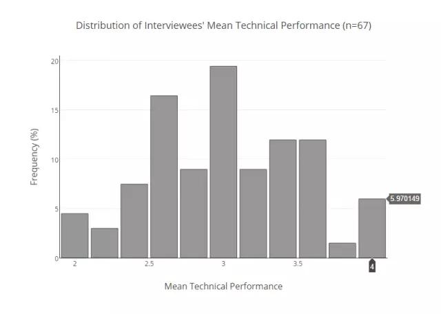 正因如此,你可能会说,无论什么原因,这样来比较技术分数都是错误且幼稚的,至少有种情况,对同一个面试者,一个面试官可能打 4 分而另外一个面试官可能打 2 分。我们在本文的附录中探讨了这个问题。这个问题确实需要讨论。然而我们大多数面试官都来自非常有实力的工程品牌公司,为了确保品牌实力,他们不会改变面试者面试表现的不稳定性,也不会修改面试官的打分。