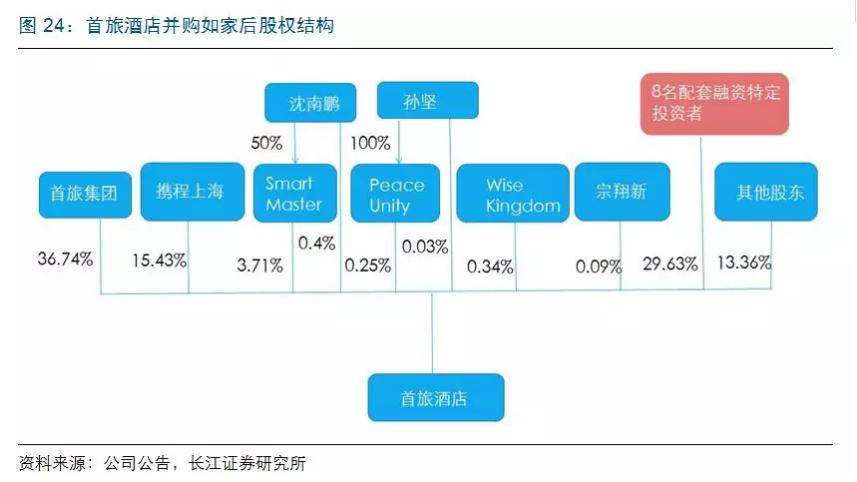 如家集团2006年10月在美国纳斯达克上市。2016年,首旅酒店通过现金及发行股份购买资产方式持有如家酒店集团100%股权。方案中如家股权33.86%是以发行股票方式进行收购的,即以15.69元/股发行共2.47亿股购买Poly Victory(持有如家14.83%股份)100%股权及7家特定投资者持有的如家19.03%的股权。该方案完成后如家原管理层持有部分上市公司股权,形成利益绑定,如家也借助首旅平台登陆A股。