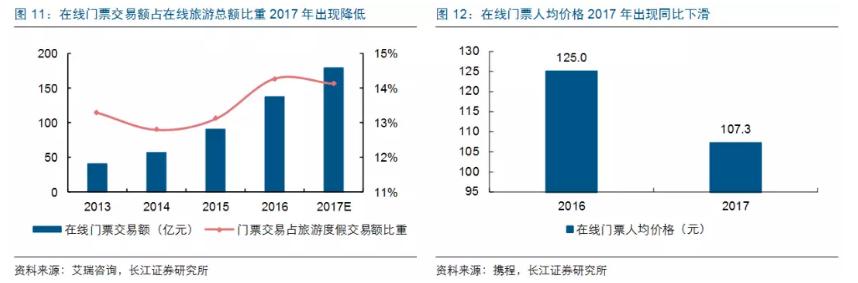 而对于非国名胜风景区企业来说,单纯的门票收入也越来越难以支撑长期的盈利。在最近几年的严控景区门票的背景下,我国景区门票已出现了下降的趋势。根据艾瑞咨询的统计数据,过去5年在线门票交易规模虽然提升迅速,但在在线旅游度假总交易规模中的占比稳定在12%至15%,且2017年相较2016年占比出现下降。此外,根据携程门票预订大数据,2017年我国游客订购门票的平均价格达到了107.3元,低于2016年的125元,下降15%。