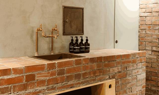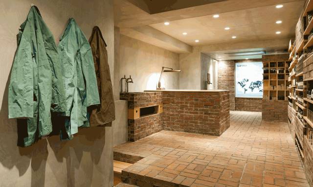 红砖覆盖的部分大约占到整个店内空间的一半,这些部分包括地面、墙壁、柜台和水槽。红砖透出质朴的温暖感,虽然都是长方形,但却因不同的排列方式和大小而呈现出多变的一面。