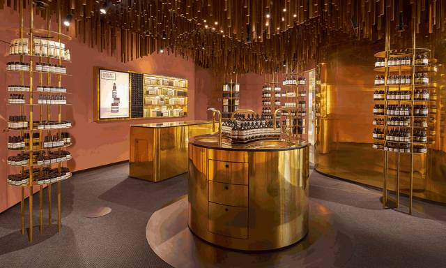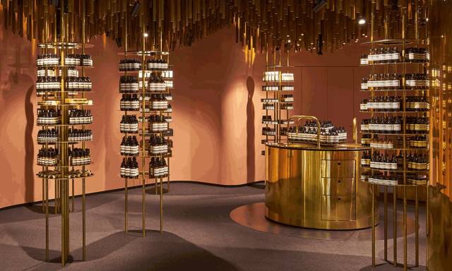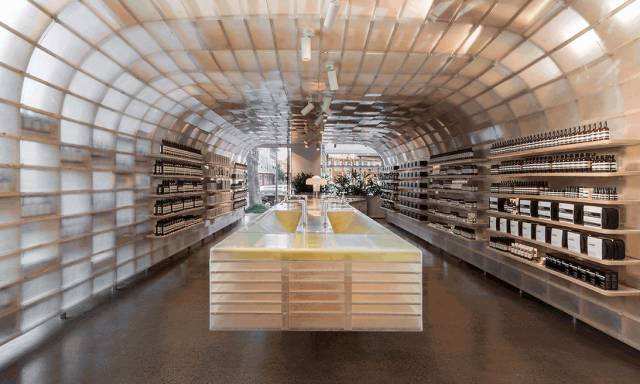 Aesop阿德莱德店是Aesop与March Studio的Rodney Eggleston合作设计的第一批概念店之一。店内设计的灵感源自一次逛农贸市场的经历,整家店其实就是在赞美Aesop的“丰收果实”,Aesop标志性的琥珀色包装瓶占据了店内的中心位置,构成了一件引人注目的天花板装置艺术品。