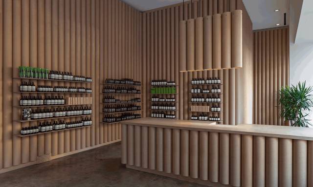 Aesop洛杉矶市中心店选用的主要材料为纸板筒,其灵感源自店铺所在的社区环境:这片区域有许多戏装店和高级时装店,店内有成捆的服装面料。