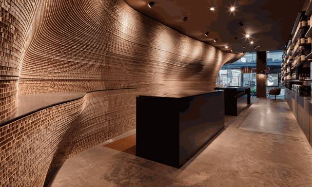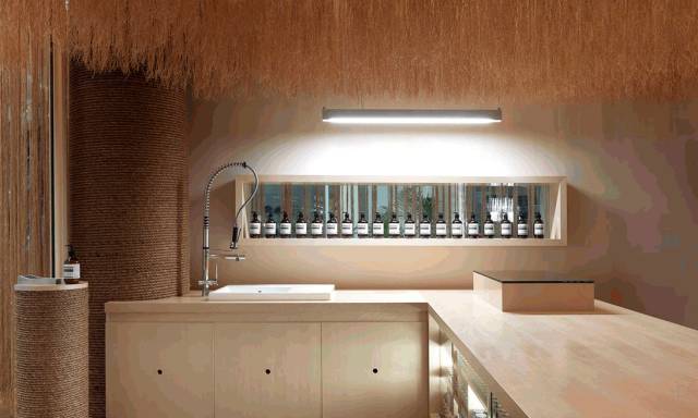 Aesop美年径店对材料的严格选控有力地证明了当地椰壳纤维工艺的美学和实用价值,以及限制和约束在设计中的意义。店铺设计者积极应对这一智力和结构上的挑战,创造出了一片崇尚静谧、令身心专注的多层次空间。