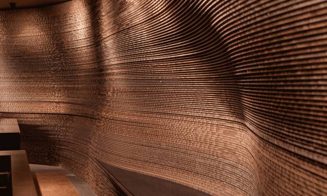 纸箱的几何形状为这种不同寻常的材料提供了视觉上的统一性。这些纸箱的对面是由堆叠在一起的大张双面包装纸板构成的墙壁,这面纸板墙从天花板一直延伸到地面,经过切割的纸板露出了夹层之间的瓦楞填充物剖面。