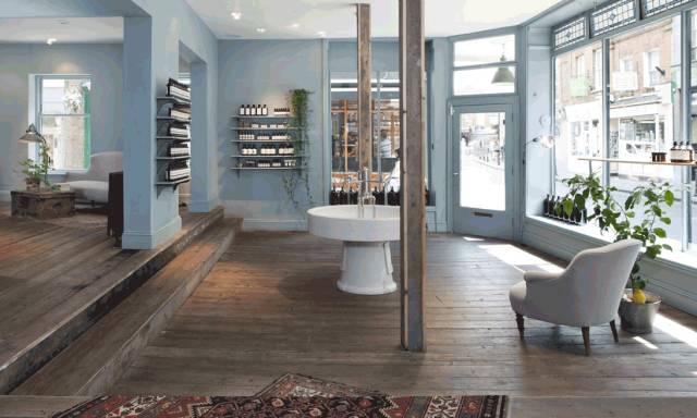 概念店共有两层,店铺的一楼有下沉式起居室。设计者将店内的墙壁刷成了蓝灰色,并对支撑搁架的托架进行了历史还原,这些都让乔治王朝时期的遗产重获新生。店铺中央是独立的白色圆形陶瓷水槽,水槽配有多方向的水龙头。粗糙的木地板、特征鲜明的饰面和不同年代的旧式陈设表明,不仅满足于忠实地还原历史,而且还进行了异想天开的重新构建,向人们暗示着这家店铺背后的独特个性。