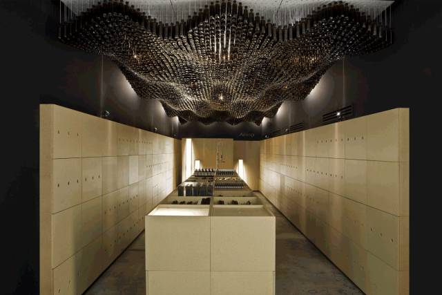设计师选用了“群植”的技术,将7560只瓶子挂在可拆卸面板上,借助长短不一的螺纹金属杆提供支撑,打造出玻璃波纹在天花板上起伏流动的效果。天花板和墙壁被涂成黑色,有些部位的后部有聚光照明。因此,一部分瓶子呈现的是黑色光泽,另外一些瓶子则发出橙色暗光,这幅景象有时看上去就像是秋分前后夜空中的满月或是一波熔融的岩浆。