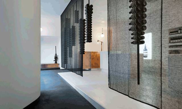 Aesop 京都概念店以谷崎润一郎的《阴翳礼赞》、京都的町屋以及日本文字的排版方式为灵感,设计团队用悬挂有 Aesop 包装瓶的黑色幔帐区隔白色空间,同时也以包装瓶和铜质管道把店铺划分为若干块展示区域,产品则根据日文顺序进行排列,整体着力营造具有传统日式美学风格的购物氛围。
