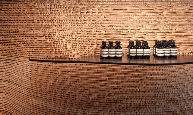 设计师用3000个折叠的纸板箱覆盖了一整面墙壁。这些立方体形状的容器是Aesop运货所用的包装箱,它们凸出的程度高低不一,构成了一面风格随意的产品展示墙。