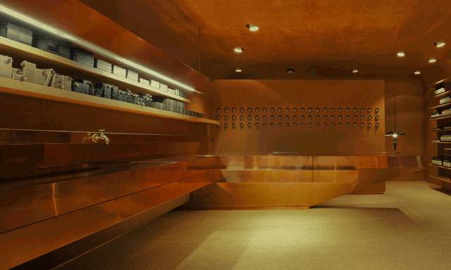 整个空间的色彩和质感都带有一种打磨后的光亮,最明显的体现是店内的主角——体型巨大、棱角分明的一体化红铜水槽及工作台。