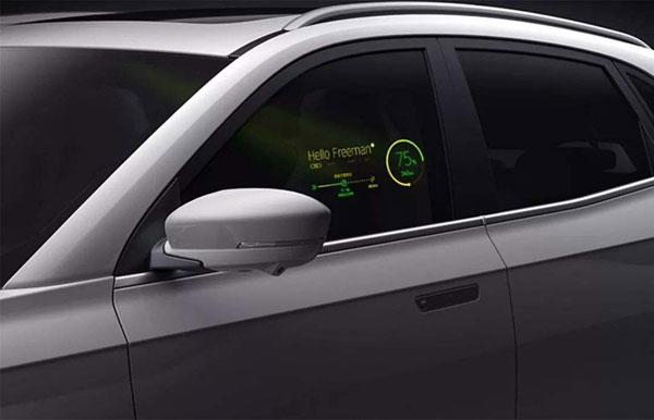 其次,威马EX5还第一个实现了车窗上的虚拟现实功能——该功能通过一个车内内置的投影仪,把相关信息投射在位于驾驶员一侧的车窗上,这就解决了在传统汽车产品中,必须进入车内才能了解车辆相关信息的不便(其实在眼下一些传统产品中,就有可以显示车辆信息的智能钥匙存在了,但此类产品的售价普遍比较高)。