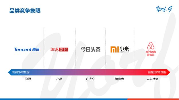 强势品牌最好是占据资源维度。比如今天的腾讯,拥有最大的基于社交关系的用户基数。而品牌定位在世界观维度,则更有利于品牌扩展。在品类衰退的时候,也能够帮助品牌进行延伸和转型。