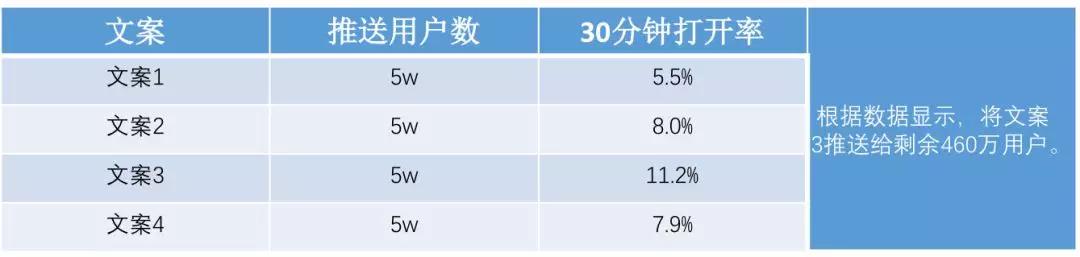 此方法是先点后面式,小范围测试,再全部推送。首先要求运营人员根据需求及目前产品用户群体,写出多条文案,然后在用户池随机选取一部分用户,并等量分布。这种方法,可以有效并快捷的找到用户喜欢的调性文案。将选择权交给用户,并不是由运营人员或者老板来决定。避免以偏概全,盲目自嗨。