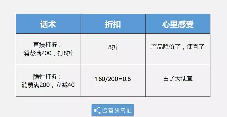 我们看第三列:心里感受。直接打折让你感觉产品便宜了,而隐性打折让你感觉占了便宜。便宜和占便宜一字之差,效果相差很大。
