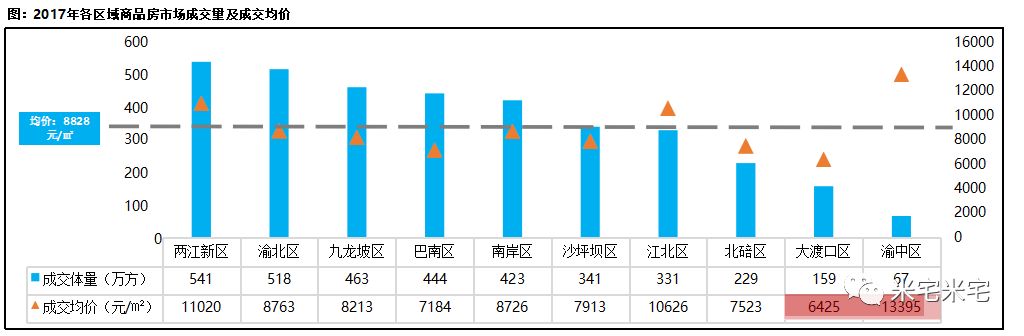 2017年重庆主城区各区商品房成交量排名前三依次是两江新区、渝北区、九龙坡区,其中渝中区成交均价继续占据高位,这与渝中区区域成熟、土地稀缺等因素必不可分;
