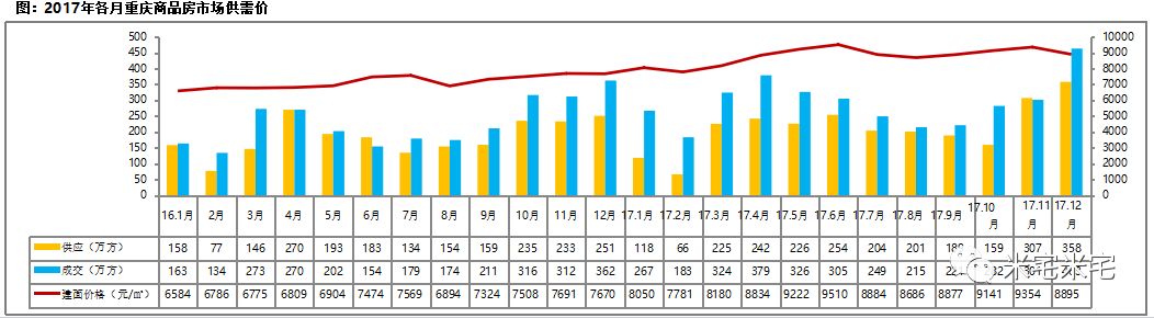 2017年重庆主城区商品房,第四季度供应加大;成交保持高位,成交均价年中达峰值;存量逐月减小。