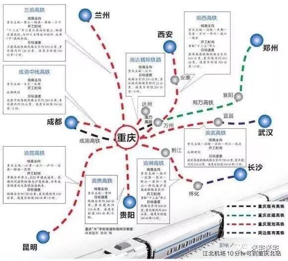 至2020年,重庆市将开工建设渝湘、渝昆、渝西、兰渝、成渝中线、渝汉等6条约1400公里高铁。最终实现重庆至成都1小时到达,至贵阳2小时,至西安、昆明、武汉、长沙4小时到达,至广州6小时以内到达,至北京、上海8小时到达。