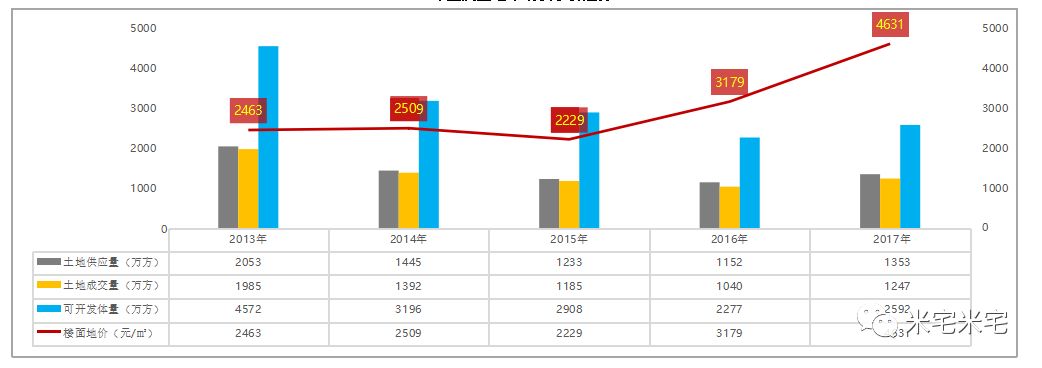 据锐理数据统计,2017年土地市场量价齐涨,楼面价达4631元/㎡。