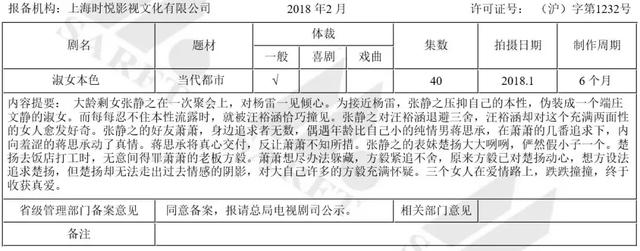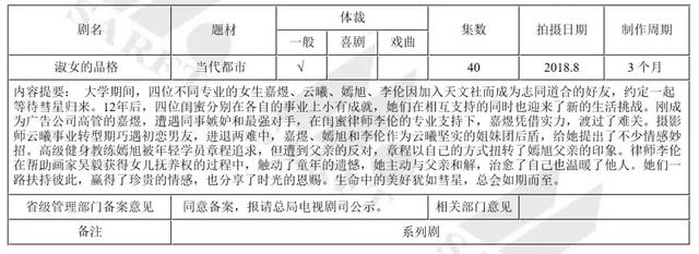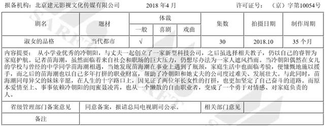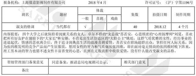 当然看上《淑女的品格》不止壹心娱乐一家。小娱查询总局官网获知,上海儒意影视和北京建元影视都看上了“淑女”,并都在4月份立了项;而更早一步,上海时悦影视在2月份就立项了《淑女本色》。