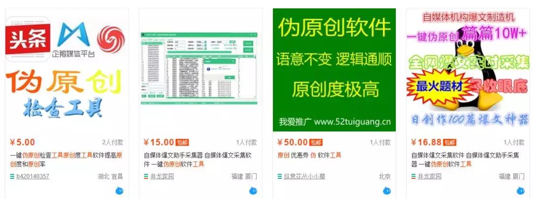 淘宝上也能搜出一些伪原创工具,售价从5元到50元不等。这些商家为招揽生意,打出了“原创度极高”“篇篇10w+”等宣传语。