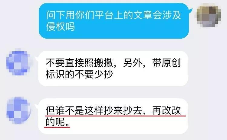 榜妹联系到客服,询问用这些文章会涉及侵权吗?对方回复:不要直接照搬。“但谁不是这样抄来抄去,再改改的呢。”