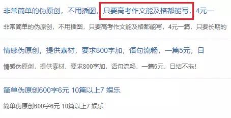 “伪原创”贴吧里,每天发布任务的帖子都很活跃。发布者会想方设法吸引写手,比如“提供素材”,“日结不拖”,还有一个直接打出了“只要高考作文能及格都能写”的口号,4元一篇,吸引了30多人留下QQ号。
