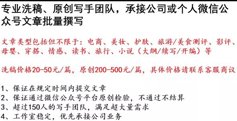 豆豆是一个写手团队的负责人,发出的广告海报上写着“专业洗稿、原创写手团队,承接公司或个人微信公众号文章批量撰写”。