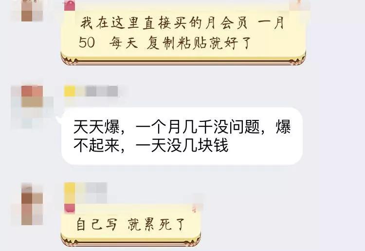 他在群里分享了自己使用的洗稿工具,可以抓取自媒体爆文,一键洗稿,美其名曰“内容优化”。“会员一个月50,每天复制粘贴就好了。”