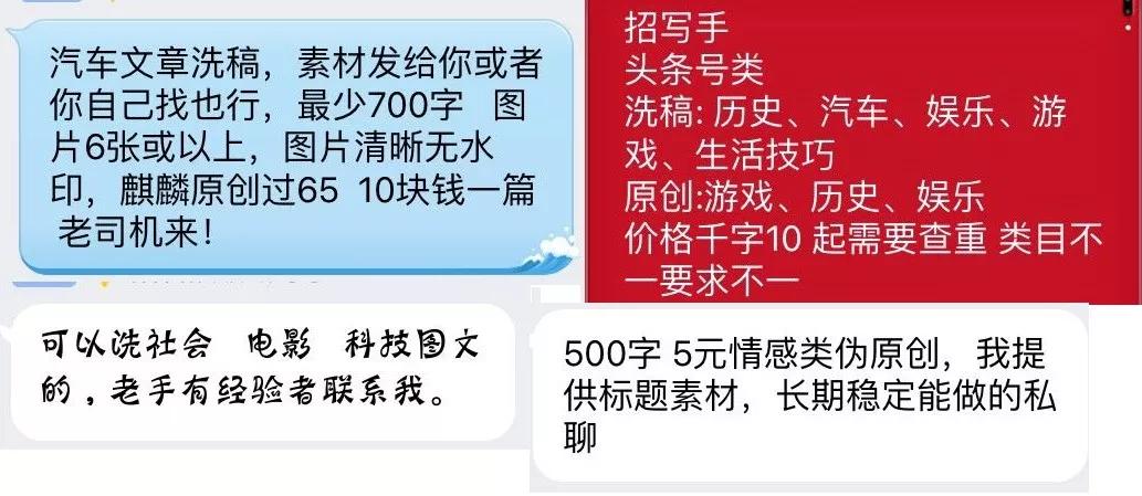 他们通过QQ群、微信群和贴吧聚集,领取洗稿任务,价格通常为千字10元,甚至更低。