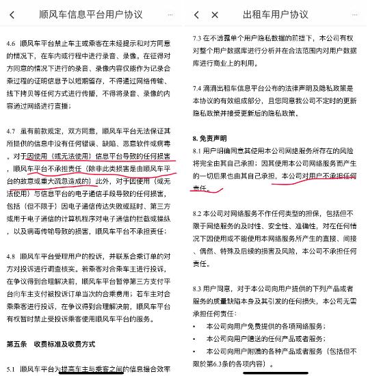 还有网友翻出滴滴平台上的各种用户协议规定,已查明发生意外滴滴到底该承担什么样的责任。从用户协议来看,顺风车平台不承担责任(除非此类损害是由顺风车平台的故意或重大疏忽造成的);出租车平台对用户不承担任何责任。所以,针对目前顺风车发生的意外事件,这算不算是平台的重大疏忽所造成的?
