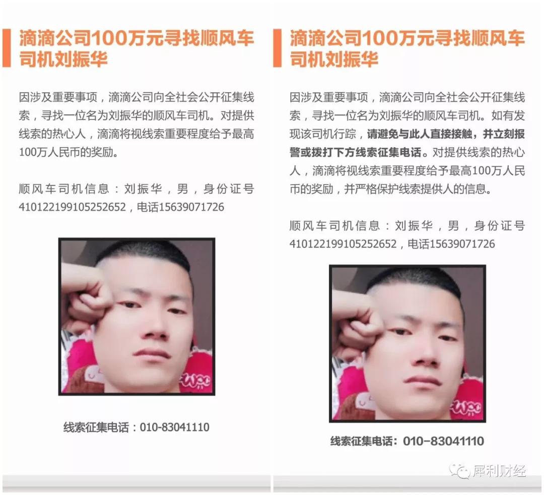 随后,滴滴又发布100万元寻找顺风车司机刘振华的公告,并公布了该名司机的身份证号和手机号码以及线索征集电话。在后续更新的公告中,滴滴加黑强调:“如有发现该司机行踪,请避免与此人直接接触,并立刻报警或拨打下方线索征集电话”。