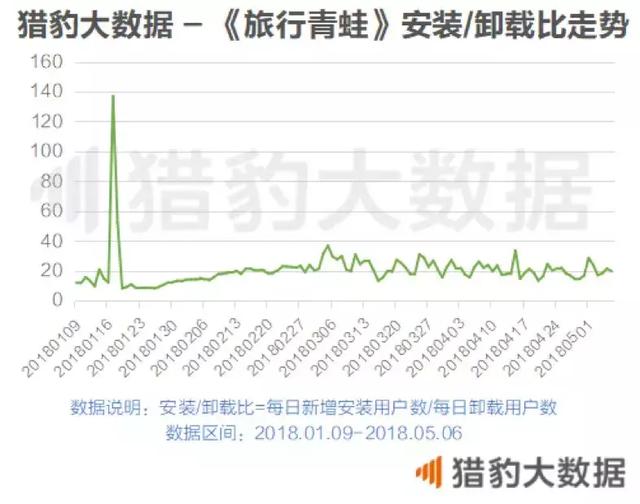 在最初的热度过后,该游戏的卸载人数经历了一个上升高峰,具体体现为安装/卸载比迎来低谷,但随后又逐渐稳定在20左右。这说明《旅行青蛙》的用户总量依然在提升。