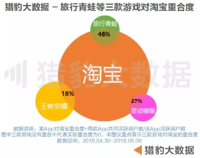 所幸的是,淘宝具备为旅行青蛙供血的基础。猎豹全球智库曾在有关原版旅行青蛙的报告中,研究过其用户画像:一线城市,30-40岁女性用户为主。这样的用户画像在淘宝看来也是比较亲切的,以4月30日-5月6日这段时间为例,原版旅行青蛙活跃用户中,有46%为淘宝活跃用户,这一比例与国民级手游《王者荣耀》及女性爆款手游《奇迹暖暖》相比也是具备优势的。