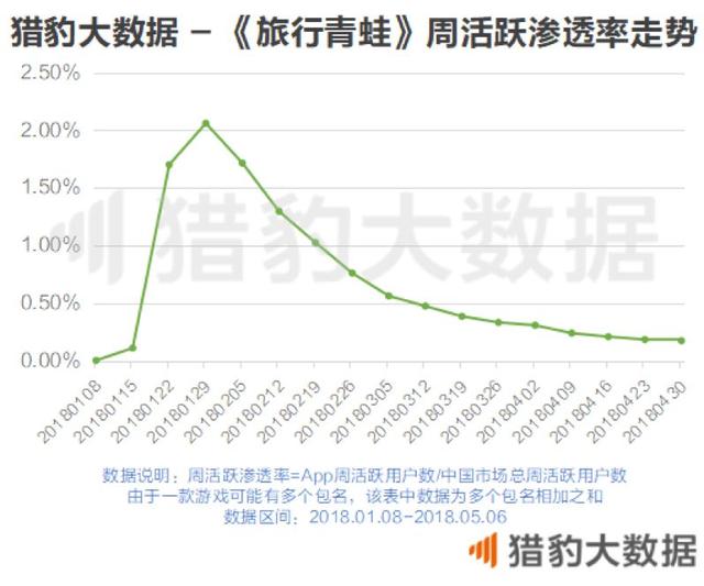 很多人不看好旅行青蛙淘宝小游戏的原因,很大程度上是认为原版游戏早已过气。从猎豹大数据监测到的数据来看,《旅行青蛙》当前周活渗透率为0.17%,在猎豹全球智库(ID: CheetahGlobalLab)此前发布的Q1中国手游榜单上排名第25。对于一款极其轻度的放置型游戏来说,这一成绩并不能说糟糕。