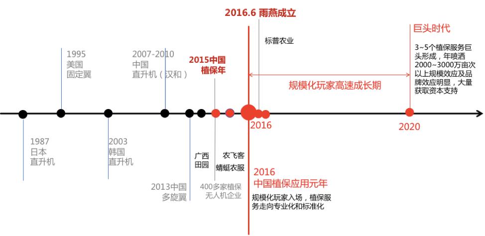 2015年被定义为中国植保无人机元年,2016年被定义为中国植保服务元年。这意味着基于植保无人机的自动化植保服务开始进入连锁化、规模化和标准化时代,同时规模化玩家开始入场。
