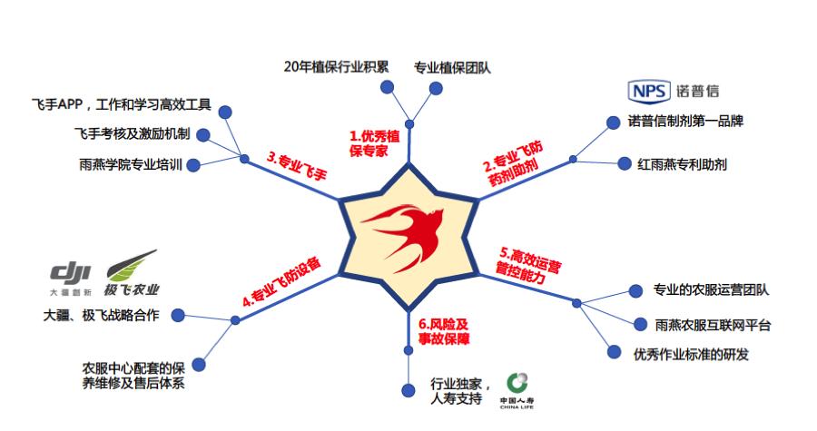 早期我们可以看到一些大的植保无人机厂商自建飞手团队,或是建立撮合平台,为终端农户提供无人机打药服务,比如农田管家、极飞、大疆等。但雨燕智能CEO王志国认为,如果将打药服务比作看病过程中的“打针”环节,那么雨燕智能希望还可以为农户提供前期的 “问诊”和“开药”服务。也就是说,雨燕智能希望提供包括无人机销售/租赁+飞手创客培训培养+专用药剂/助剂研发供应+专业植保方案+标准化作业+商业保险在内的完整集成式服务。雨燕智能提供的是无人机全程植保服务而不是无人机打药服务,打药只是全程植保服务中非常小的一个环节。