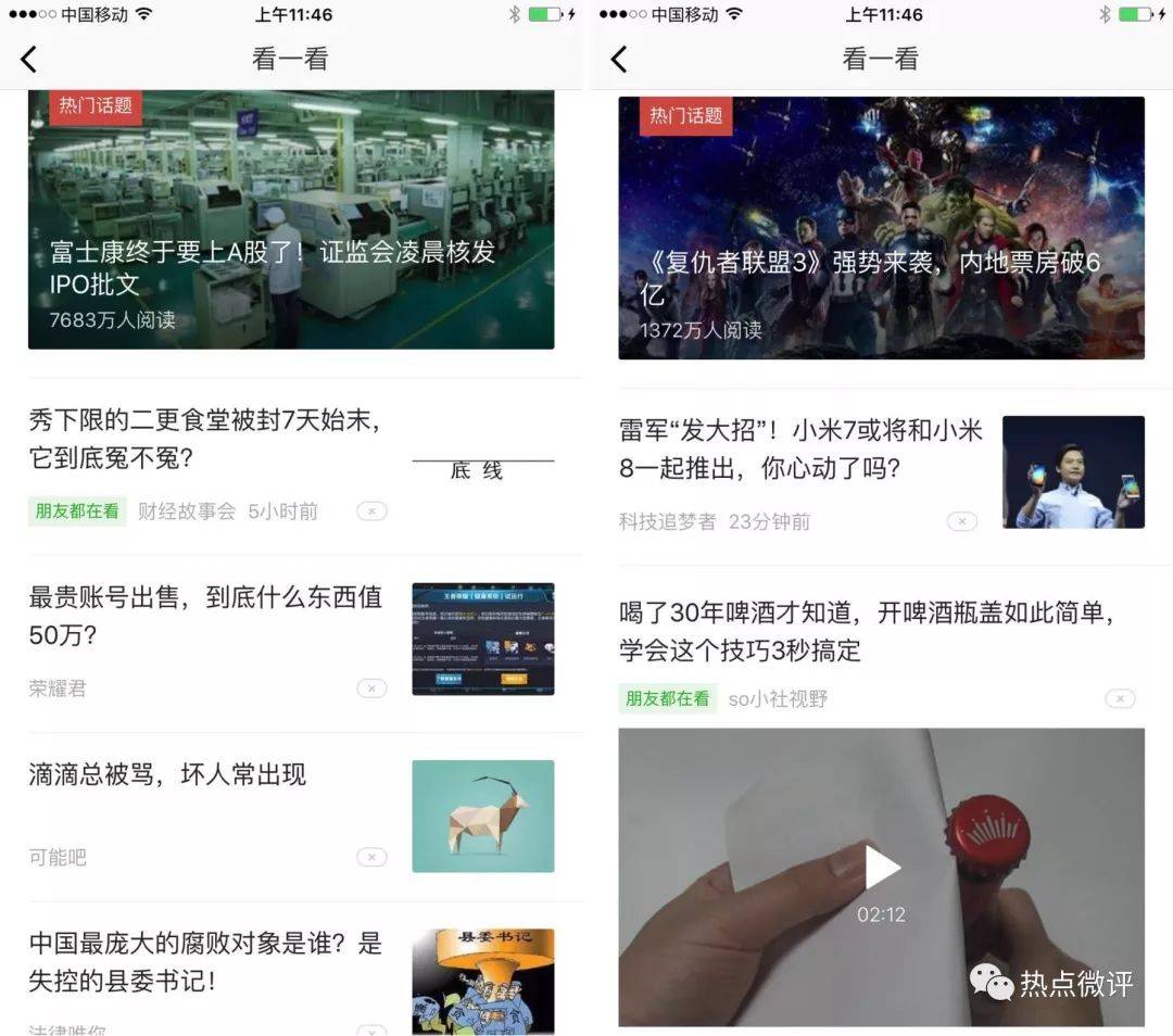 这个信号的释放也不得不谈到微信在4月底正式上线一个新功能叫“热点话题”,该模块将出现在看一看入口和参与热点的文章底部。可以看出微信对于其去中心化的机制做了调整,因为“热点话题”相当于在微信内部建立了一个中心化的入口,将相关的内容通过话题收拢,可以让部分参与热点的公众号都归拢到这个话题下,中小号也有机会依赖看一看入口的热点话题的入口获取粉丝与流量。
