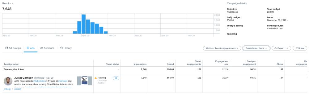 在AWS Re:Invent大会期间,我到一个有趣的点子,在Twitter上面发动一次营销计划来引起大家对这本书的一些兴趣。我花了50美元的推广计划,最后产生7648次印象(看到这条推特的人数)以及37次点击(点击那条链接)。我还把那条推特置顶但是觉得不值得花那笔钱。我想它并没有带来任何销售而且每次互动的成本达到了0.31美元。那次推广之后我又发了另一条推特,这条推特后来被一位有很多粉丝的朋友转发了(我没有要求他们转),结果那一条所带来的互动比付费的营销推特效果还要好。
