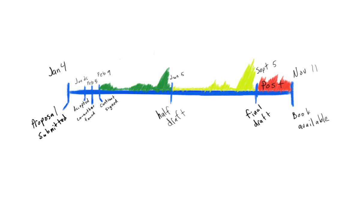 总而言之,我写这本书的时间跨度是2月到10月,每周大概用5个晚上的时间,每晚写2到3小时。在草稿或者最后编辑截止期到达之前我还会马不停蹄地工作3个周末。粗算一下这大概是500小时的工作量。而这只是我自己的时间还没有算上Kris的。我很幸运有一位共同作者分担。