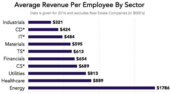 从这张表可以看出,能源行业的员工创造的收入最多。