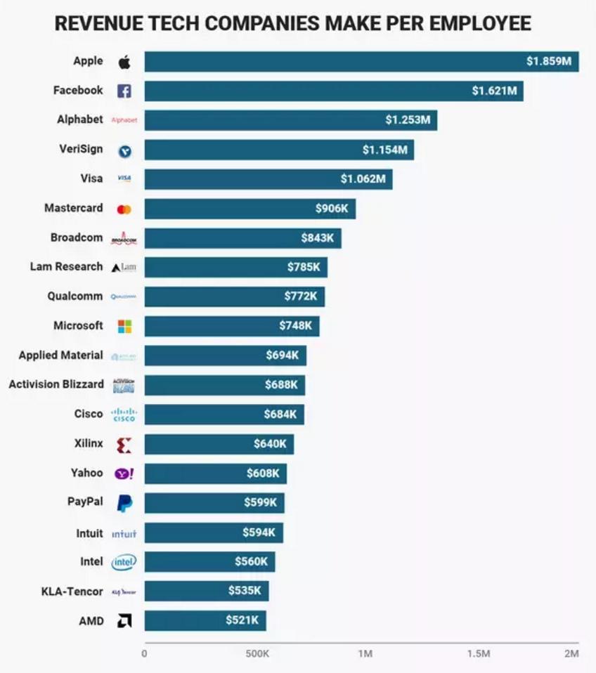 从这张图片可以看出,苹果员工的平均收入最高,达到185.9万美元,Facebook也达到了162.1万美元,Alphabet以125.3万美元排第三位。