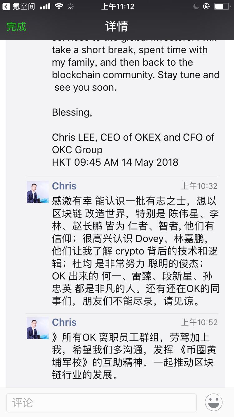 李书沸在其朋友圈下评论道:“所有OK离职员工群组,劳驾加上我,希望我们多沟通,发挥《币圈黄埔军校》的互助精神,一起推动区块链行业的发展。”
