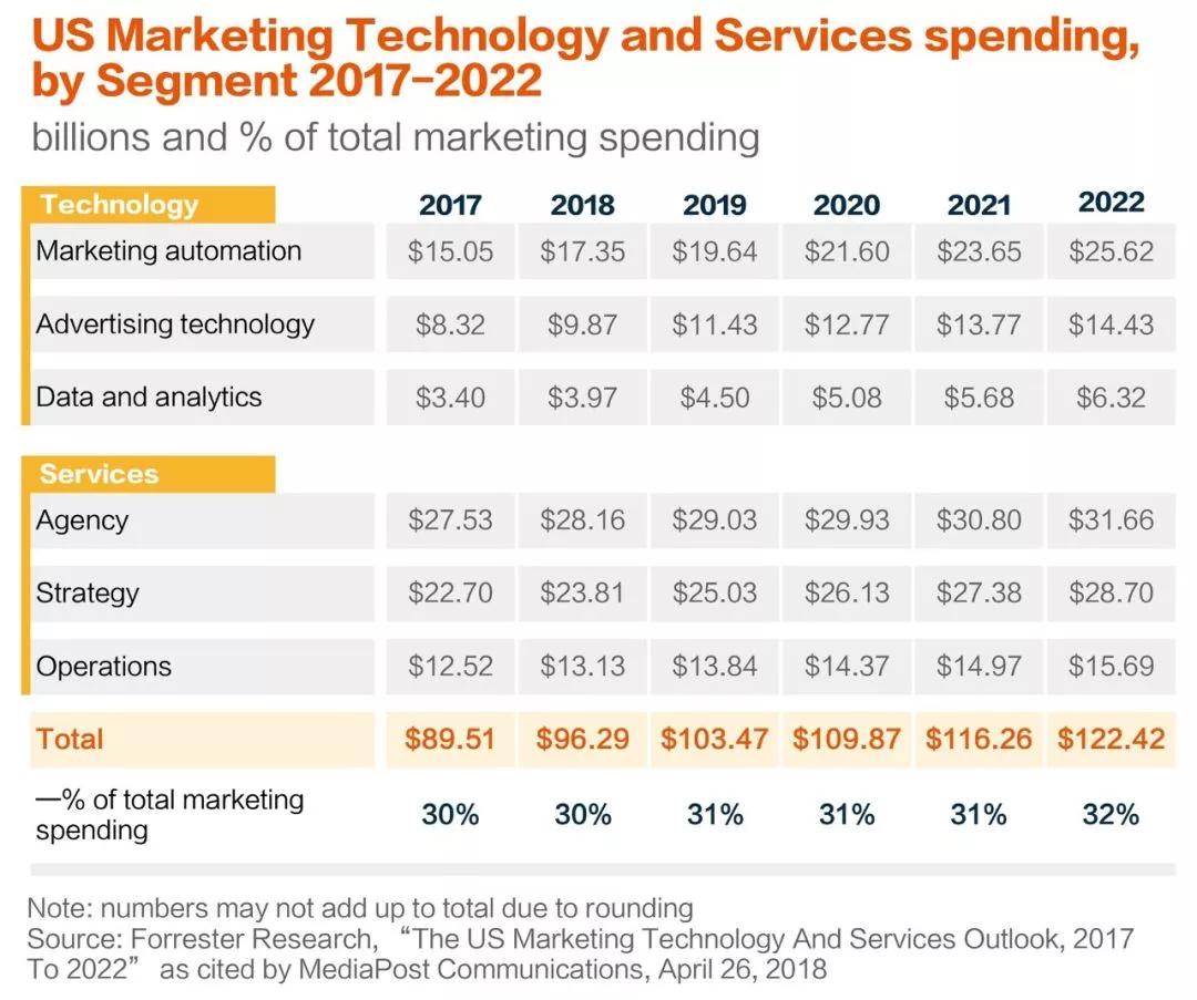 只看2017年的数字,美国整个企业营销市场2984亿美金,整体的分布是:70%的钱,2088亿美金去采购了各种媒体广告,剩下的30%/895亿美金花在了营销技术和服务采购上;9.2%/275亿美金的钱是媒介代理服务费用(Agency);策略服务,包括创意(Strategy)和运营服务(Operations)的钱分别是227亿/7.6%和125亿/4.2%, 这两个加在一起达到了整体预算的11.8%;然后是MarTech的市场150亿美元/5%, AdTech的市场83.2亿美金/3.2%,数据分析和服务市场34亿美金/1.1%。