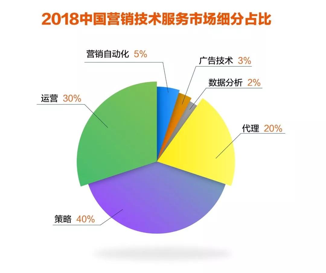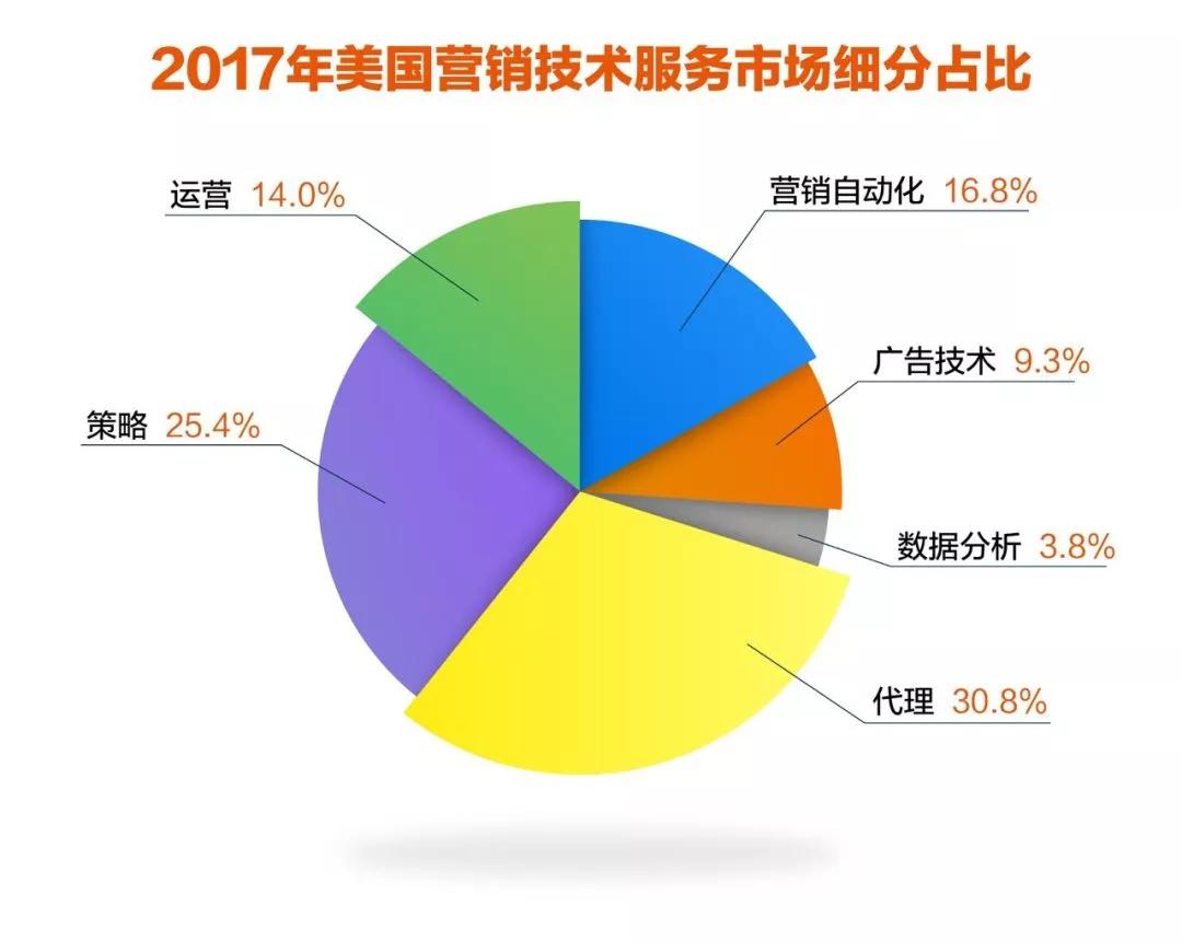 首先,先投细分市场中的大赛道。我们拿美国的数据来看,如果我们把媒体拿走的70%的蛋糕不看,只看各细分市场在营销技术和服务预算中的比例,是这样的: